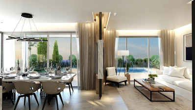 The villa belongs to a residential development consisting of detached villas on generous plots, each with a private pool. Intelligent design and modern architecture create a flowing open-plan living area both indoors and outdoors. The residences have gated entrances with private parking and provide green areas for gardens and plantings.